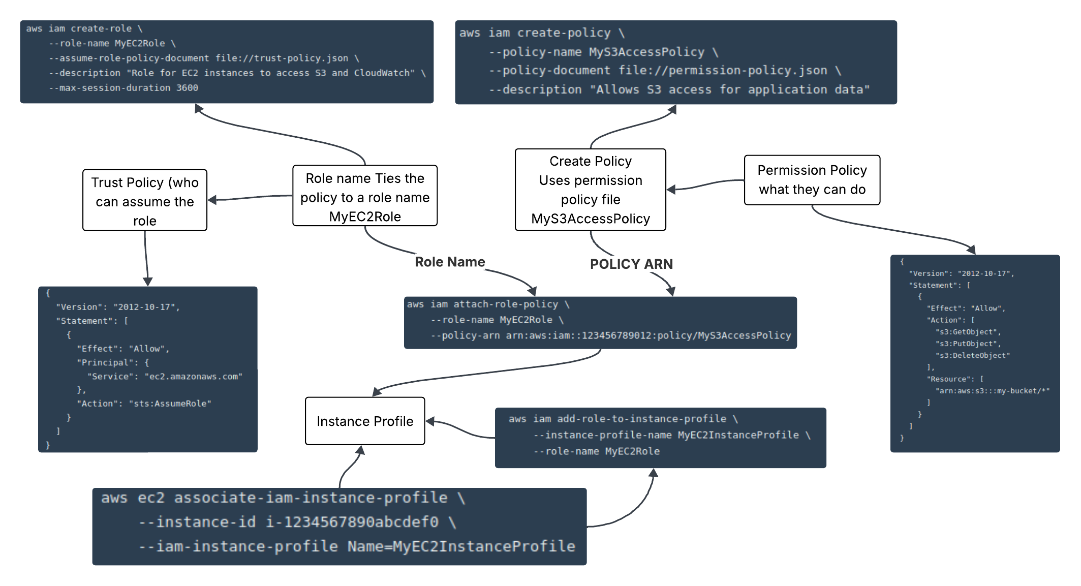 Command Sequence Flow: This shows the logical order for creating IAM roles. You start by defining the trust policy (who can assume the role), then create the role itself. Next, you define permission policies (what the role can do) and attach them. For EC2 instances, you also need to create an instance profile and associate it with the role.